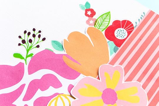 Luckily, the flowers were big enough so I didn’t have a problem covering a big area with them. To make my cluster more interesting, I grabbed the On a Whim and Oh Happy Life sticker sheets and pulled more floral images and leaves. I used the floral stickers to fill the gaps between the bigger flowers and also balance the colors through the layout.