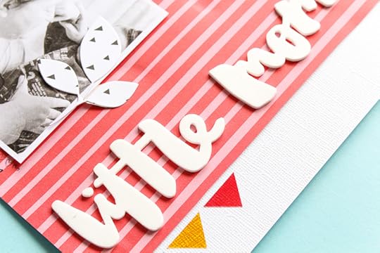 I didn’t want my title to be distracting so I picked some white foam words from the Oh Happy Life thicker pack and placed them vertically on the red striped paper. The red color was bright enough to create a nice contrast and still let the title pop a bit.