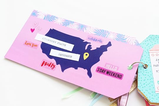 I decided to create an oversized hang tag mini for this project as I didn’t want to fuss with an actual album, but I did want to have a lot of room and flexibility to create as many pages as possible. There are a lot of photos and stories from this particular weekend that I wanted to be sure and document. I also wanted enough room to use the larger embellishments like the foam phrases and that wicked blue USA Sticker, so I had to scale it up.