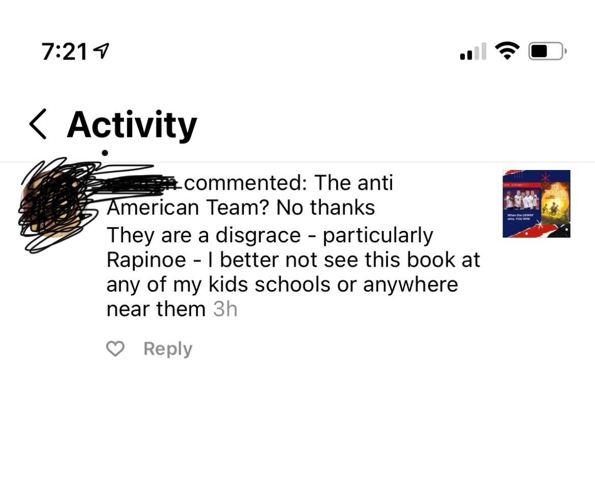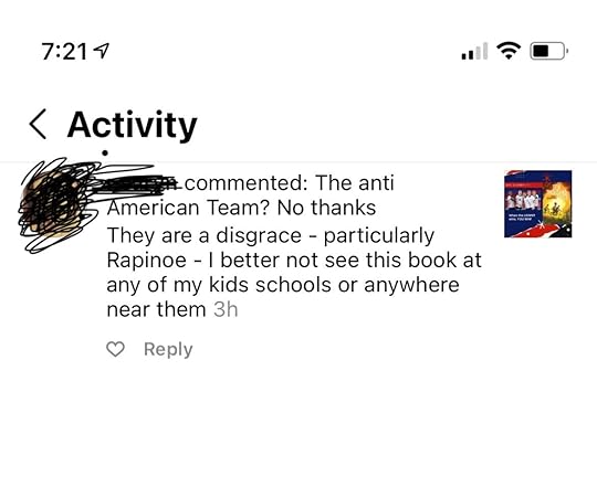 My own books have not been banned (that I know of,) but I remember the jolt I felt when a woman left this comment on my Instagram after I posted a giveaway of TEN THOUSAND TRIES next to the US Women’s Soccer Team World Cup win: