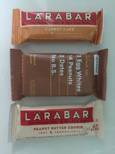 RX and Lara Bars. 3-5 ingredients in them and that’s it! (The carrot cake bar above has 9 ingredients but all are “natural” and words I can pronounce.)