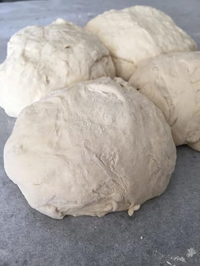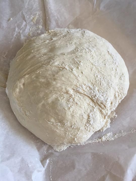 Lightly flour a work surface or parchment paper. Using just enough flour to keep dough from sticking to your fingers, work dough into a ball and onto the floured surface. Sprinkle with a little more flour and fold it over on itself once or twice. Let rest about 30 minutes (OR longer – NYT lets it rest for 2 hours!) When dough is ready, dough will be more than double in size and will not readily spring back when poked with a finger.