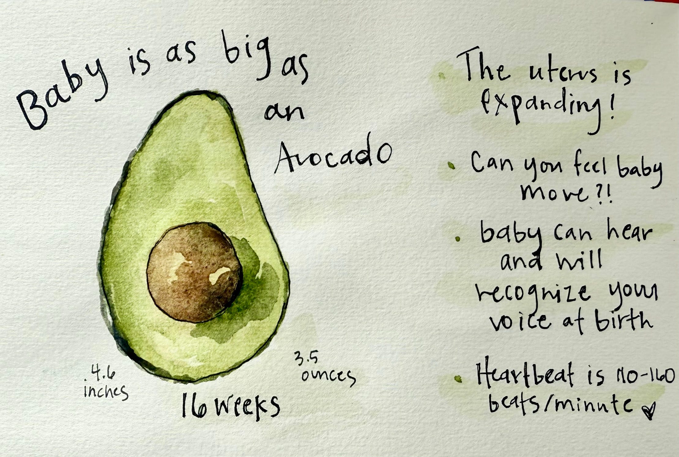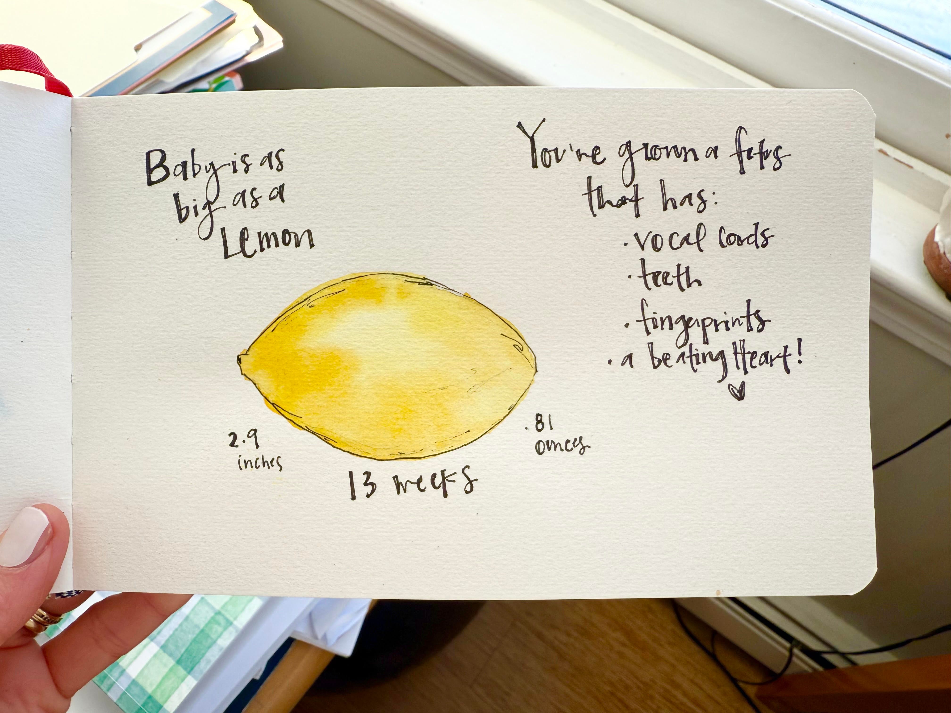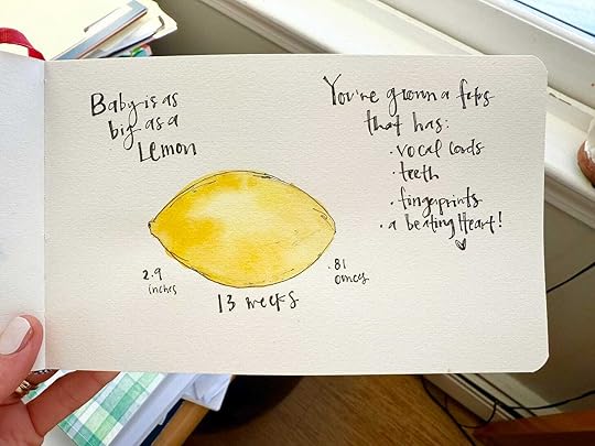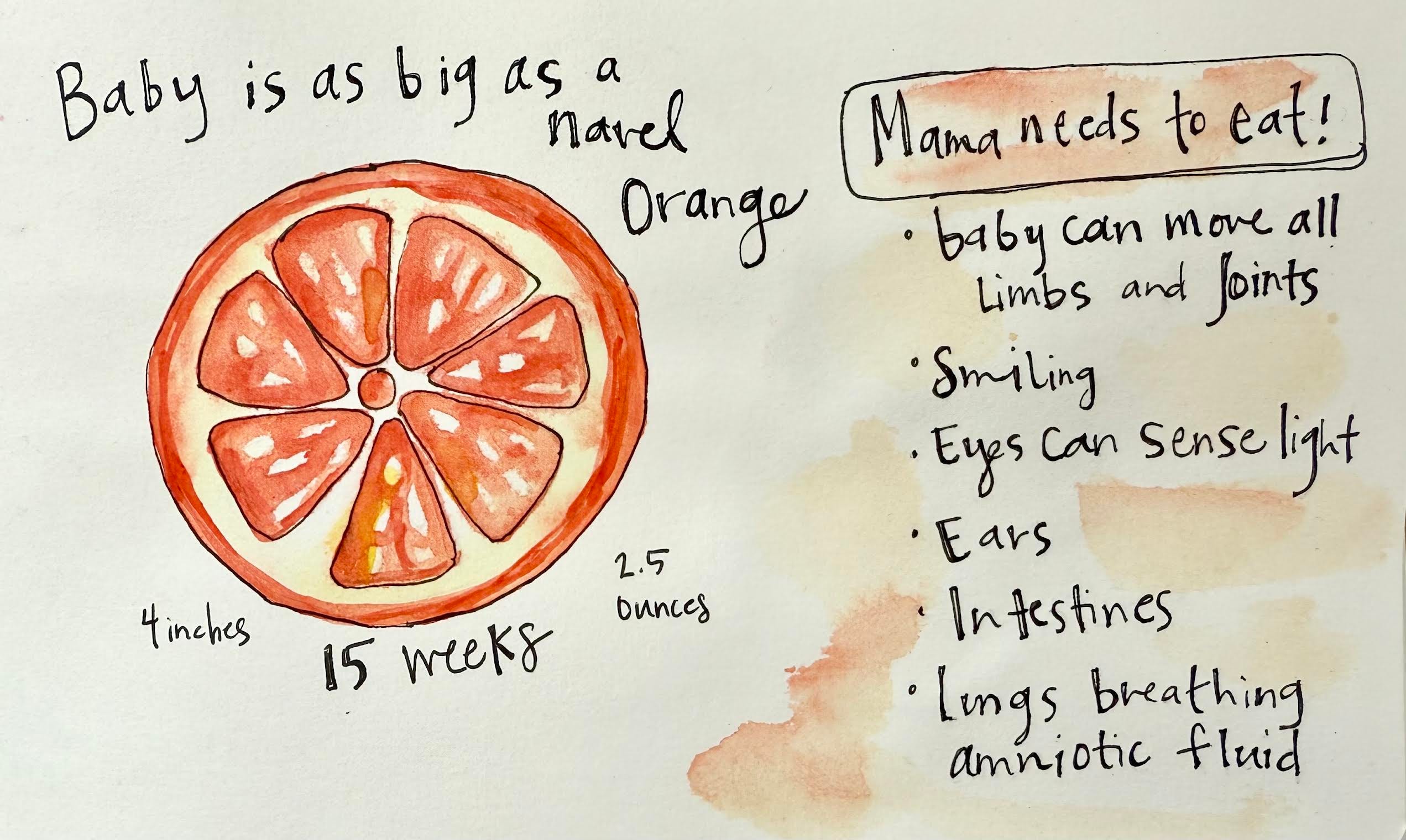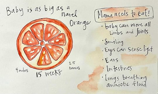 My daughter is in her second trimester and the baby is as big as an orange. So exciting. And it’s fun to paint along with the baby bump even though I’m pretty critical of this orange (but never baby!)