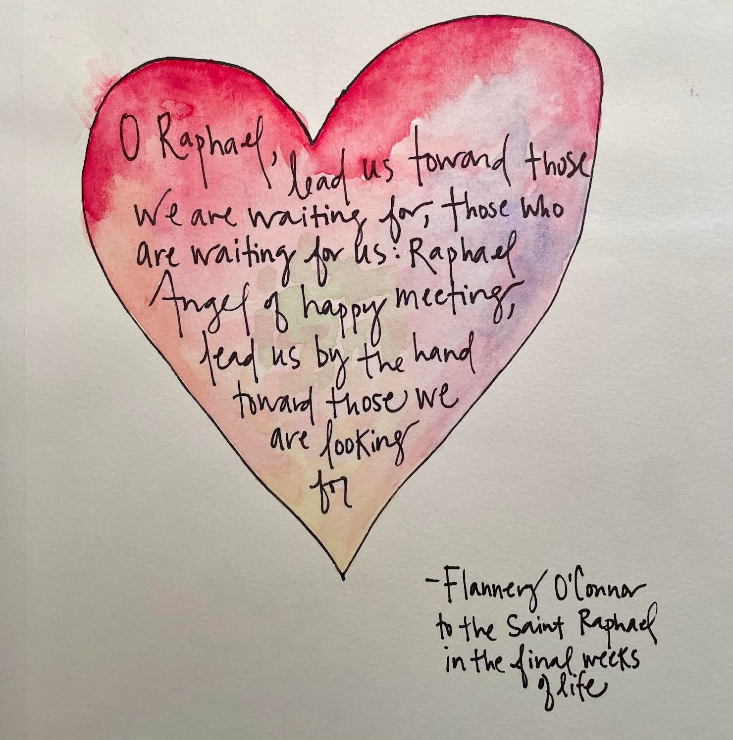 O Raphael, lead us toward those we are waiting for, those who are waiting for us: Raphael, Angel of happy meeting, lead us by the hand toward those we are looking for. oh angel of happy meeting…