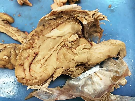 See the shiny outer layer peeled off? That’s the dura mater “tough mother”Kids will be so grossed out and first and proclaim I CANNOT LOOK AT THAT, SMELL THAT, TOUCH THAT…and by the end of class, they’re wearing gloves and cutting with scalpels, saying WOW. The shiny outer layer of the brain is called the “dura mater,” a German word that translates to “tough mother,” because of how tough and impenetrable it is to disease and foreign substances.