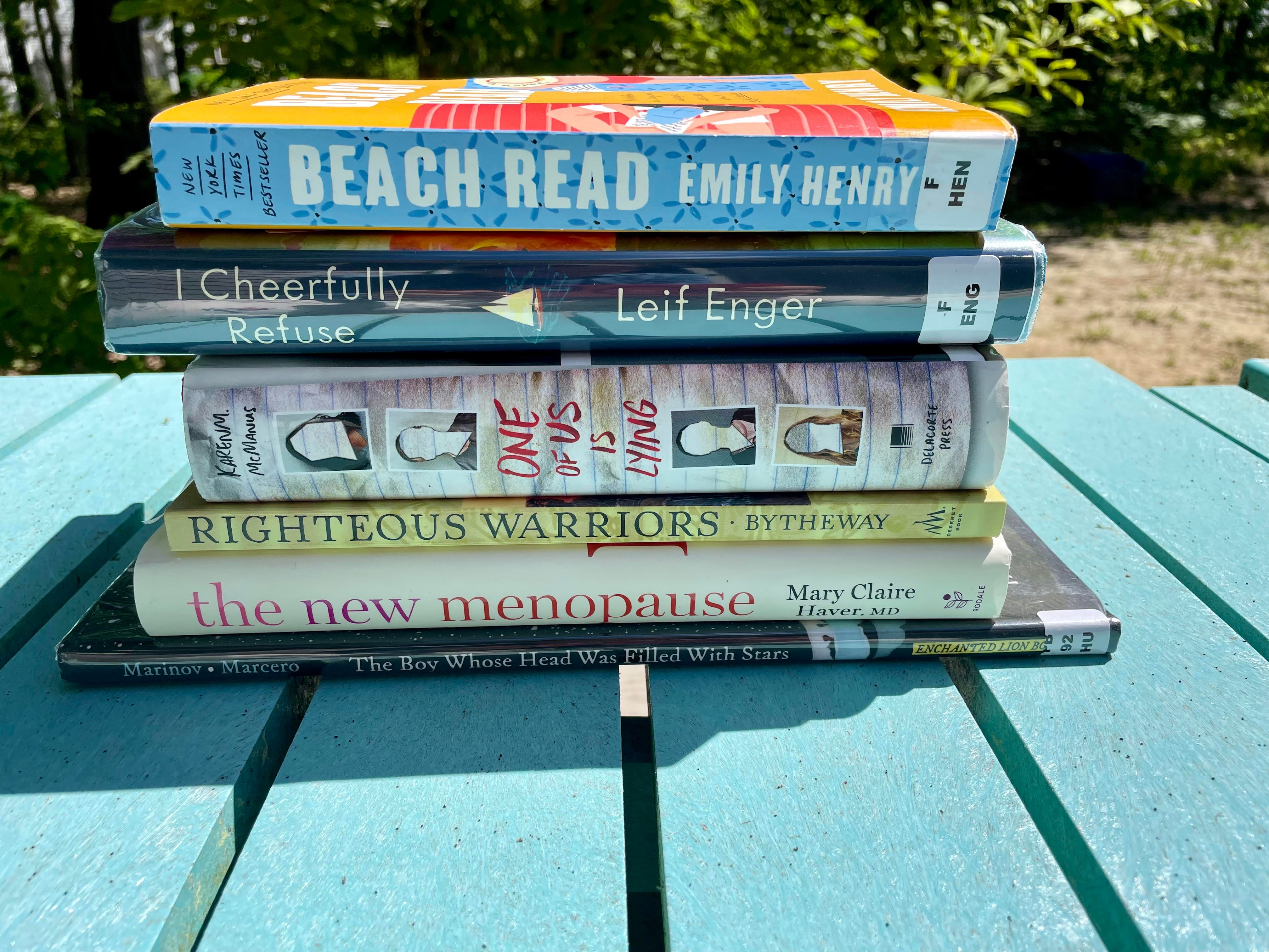Yep, I still travel with too many books; no kindle for me…yet?I’ve never read an Emily Henry book and Beach Read seems an obvious ocean escape choice. Lief Enger’s Peace Like a River is one of my most favorite books of all time, I Cheerfully Refuse comes highly recommended. One of Us is Lying is a good comp title for my latest work-in-progress, while Righteous Warriors will aid my spiritual study. I’m super psyched to read Dr. Mary Claire Haver’s new release The New Menopause (NY Times Bestseller the last four weeks), and I brought the picture book The Boy Whose Head Was Filled With Stars, a story about Edwin Hubble and the telescope. I have since encountered a beach house full of books including a large collection of Dog Man by Dav Pilkey who has the best author bio ever: