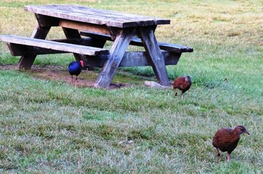 While I was in the nearby Abel Tasman National Park, I checked out the Tōtaranui campsite to see how the local wildlife was coming back. Years ago, there was nothing but the introduced Australian brushtail possum to be seen. Now the possums are in retreat and the flightless weka (mostly brown) and semi-flightless pūkeko (mostly blue) are numerous once again, running around in mixed flocks on the ground. Dogs are strictly banned, as they would make short work of such ground-dwelling birds, the cheeky and fearless weka in particular.