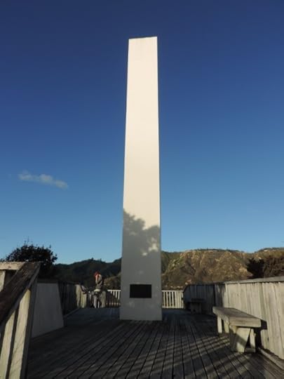 First off, here’s a picture of the Abel Tasman National Monument, on top of a hill between Pohara Beach and Ligar Bay. It looks simple but it is stunningly effective, like the black slab in 2001: A Space Odyssey, except that it’s a white slab that catches the sun and can be seen from a great distance. It was re-dedicated by Queen Beatrix of the Netherlands in 1992 and is one of thirteen New Zealand National Monuments.