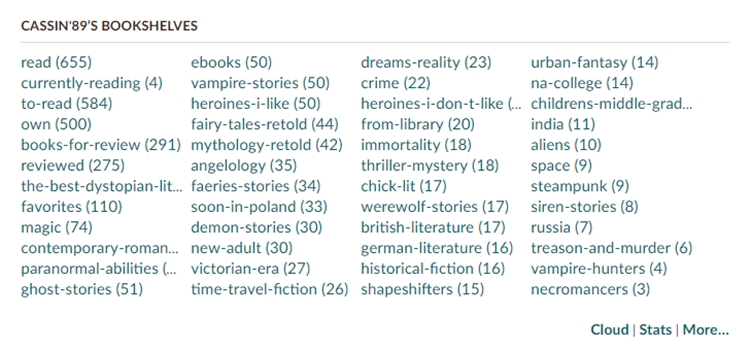 Profil Cassin '89I o to właśnie mi chodzi! Chyba nie ma czytelniejszego sposobu na podzielenie książek według wymyślonych przez siebie kluczy. I jeszcze jedno - choć serwis jest dostępny w języku angielskim, te dodatkowe półki możecie nazywać po polsku.