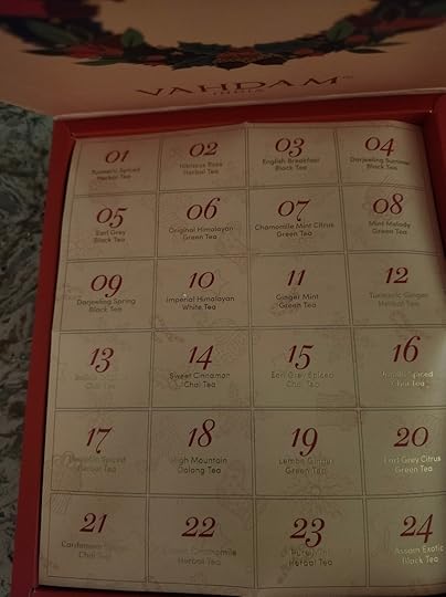But the surprise kept going. We knew it wasn’t the usual David’s Tea calendar, but we sort of thought (and so did she!) it would be done up like an Advent Calendar. You know, doors you open, boxes that pull out…You’ll see looking at this that it does have a very clever tea schematic in terms of what tea you get on what day. You may also notice that all the tea is just sort of…hanging out in different quadrants of an admittedly charming box. Obviously what’s supposed to happen here is that you’re supposed to put them in those reusable Advent Calendars, you know the kind? Bags, boxes, blocks…We’ve seen at least one overpriced model by Indigo.