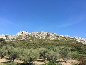 One of the things we enjoy most about this area is the biking. St-Rémy is right next to the Alpilles, a low mountain range with rocky outcroppings. Well, to call the Alpilles “mountains” is a bit of a stretch, they are more like big hills. But they rise up dramatically and look taller than they actually are, kind of like the Scottish Highlands.