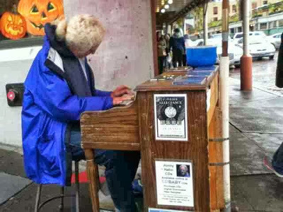 Here's one of the street musicians in the market, name of Jonny Hahn. Any man who can drag a piano out every day, in the rain, AND be a leftie activist - hey, I'm putting money in the hat. And yes, I posted his information, so you can buy CD's. He's good!