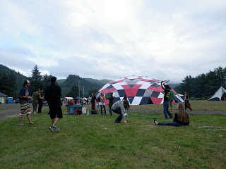 Photosynthesis 5 starts another morning with stretches in the Hobuck Campground in Neah Bay.My cut line for the local paper: "This popular techno-music festival returned for a second year, offering long nights of music, light shows, bonfires, massage and healing tea ceremonies. Local and traveling vendors find eager daytime customers for food sales, costuming materials and jewelry."