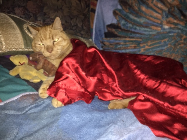 True, his pupils don't expand or shrink at the same time or rate, and at night he wanders the house yelling, with a stuffed toy named Yellow Bear in his mouth, all of which signals dementia. Well, I don't know if Yellow Bear is part of that, but he participates.