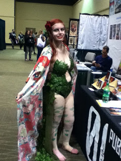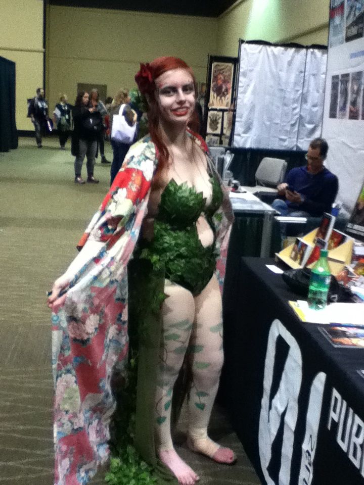 Poison Ivy is a great costume, but it comes with very high heels. Ivy kicks back with the kimono she wears to get to her car, and no shoes. I say she could get away with red flats. To match her hair.