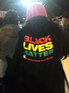 The pink sign around my neck says "Jews for Black Lives Matter." The woman passing them out said that, before, when they'd made signs for different groups, they ran out, and then everybody wore the Jewish signs. So she just made the Jewish signs this time. So I wore one.