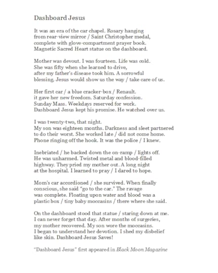 I am thrilled to have my poem “Dashboard Jesus” (reprint) published in Sparks of Calliope. Thank you editor, Randal A. Burd, Jr.