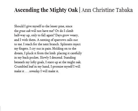 I am super thrilled to have my poem “Ascending the Mighty Oak” (page 12) published by the Elevation Review. Thank you, Editor-in-Chief Thomas Kneeland, and the Editorial Team.