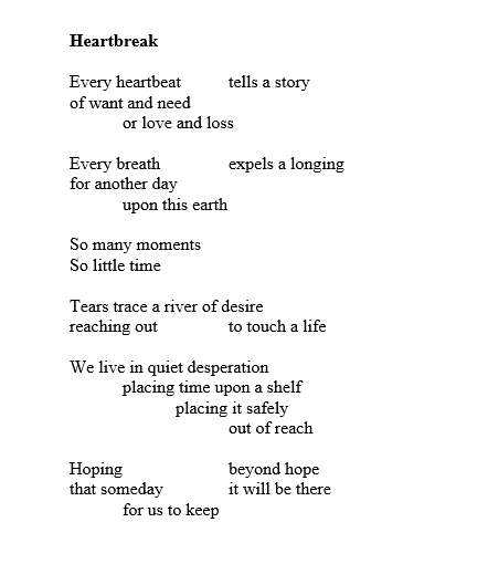 I am grateful to @Steve Cawte for including my poem "Heartbreak."