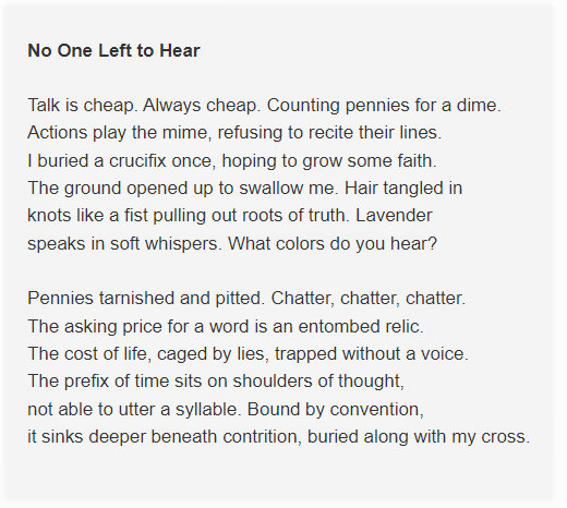 I am elated to have 6 poems published by Synchronized Chaos Magazine. Thank you, Editor, Cristina Deptula.
