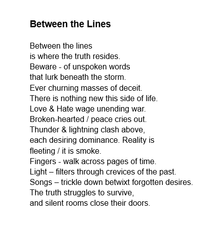 Between the Lines – Chosen as one of the 4 Best Poems submitted to Masticadores Canada