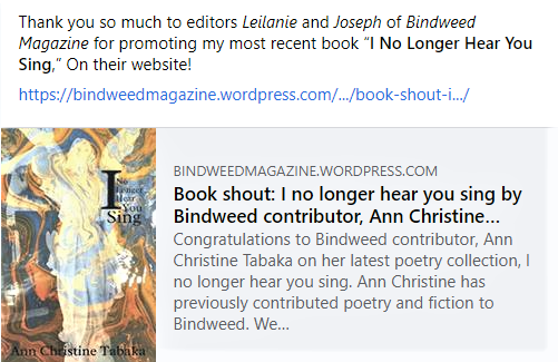 Thank you so much to editors Leilanie and Joseph of Bindweed Magazine for promoting my most recent book “I No Longer Hear You Sing,” On their website!