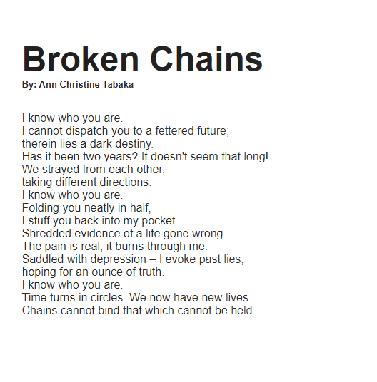 I am thrilled to have my poem “Broken Chains” published by The World of Myth. Thank you, Editors Stephanie J Bardy & David K. Montoya.