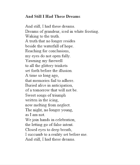 This poem is from my book "And Still I Had These Dreams," published by Clarendon House Publications, and available on Amazon.