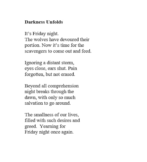 Here is the first stanza of my poem “October Night.” The entire poem can be read in my newest book “Pondering the Shoreline of Existence,” published by Impspired. The book is available on Amazon. Thank you.