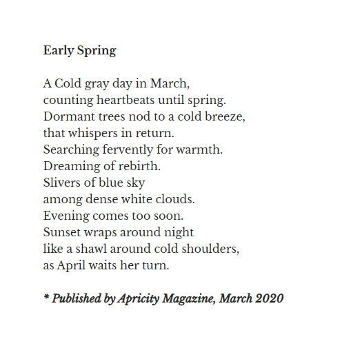 I am very excited to have my poem “The Beauty of Another Day” published by Arts of Poetry. Thank you, editor Denise Toro!
