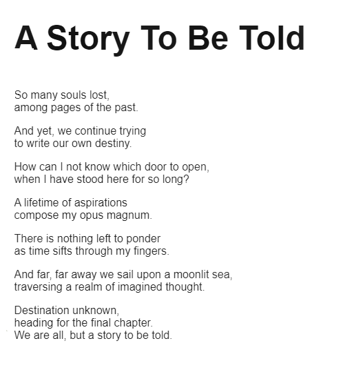 Here is an excerpt from "A Story Lives Within Us All." You can read the entire poem in my newest book "Running Backwards In Time. The book is available on Amazon.