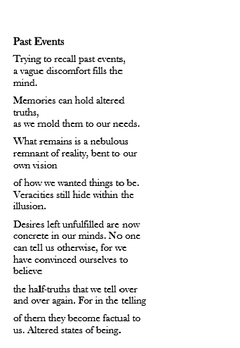 I am excited to have my poem "Past events" (page 42) published by Poets' Espresso Review. Thank you editor Patricia Ann Mayorga!