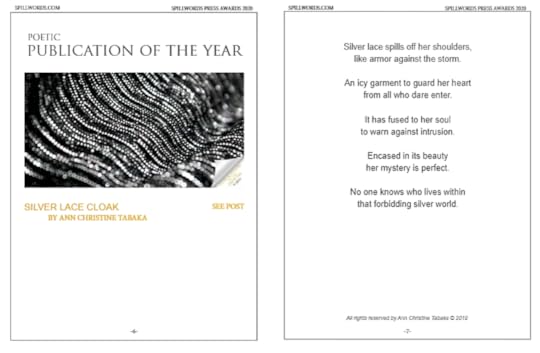 THANK YOU to everyone who vote for me. My Poem "Silver Lace Cloak" was voted The Poetic Publication of the Year on Spillwords! I am so grateful for your support! CONGRATULATIONS to the winners of the other categories!