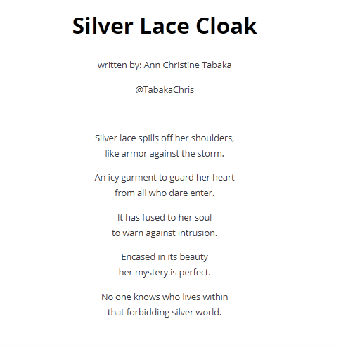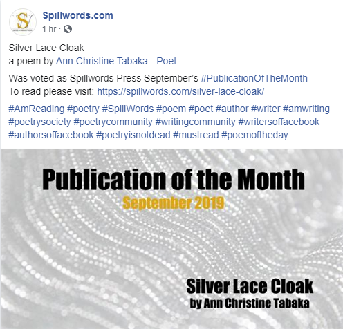 I am and thrilled that my poem “Silver Lace Cloak” was voted as “Publication of the Month” by readers of Spillwords. Thank you very much everyone who voted for my piece, and congratulations to all the other writers whose work was nominated.