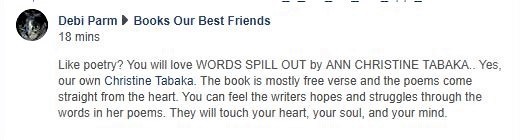 My newest poetry book, "Words Spill Out," published by CTU Publishing Group, is now available on Amazon. Thank you so much Raja Williams for all your hard work in getting this book to press. And a lovely review by Joanne Olivieri.