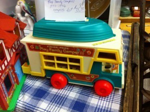 Earlier this year a friend of mine who shares my love of treasure hunting found a bunch of vintage Fisher Price at a garage sale up north, dirt cheap. I was jealous! Then I realized my kids are long past them and my nieces and nephews are well-stocked with toys. So I was satisfied with the thought of visiting them at Lisa’s house.