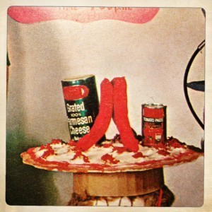 The thing that perplexes me most about the pizza hat is the execution. What is UP with that Eiffel tower of pepperoni in the center? It is made of red socks. Recycled socks. Think about that for a moment. Appetizing? Not so much.