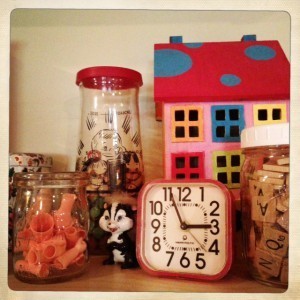 The clock pictured here in my crafty nook would not grab me by description alone. I like red but it’s plastic and 80s era and neither one of those descriptors make my heart skip a beat. But look at it! It’s sweet and represents the best of 80s style rather than the worst. (Who needs an overstuffed purple reclining sofa clock, anyway?) And! It was handpicked for me by a friend who (oh baby) knooooowws what I like!