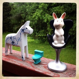 I know that my affection for tiny furniture has something to do with the fact that our household was always in some sort of physical chaos (renovation, moving, etc.) when I was growing up. I love nesting. But I also love the mind play that happens when I handle small objects. I did a lot of imaginative play until I was quite old…dolls, paper dolls, Fisher Price, Legos. It was both a creative outlet and an escape when things were kind of ragged on the home front. Imaginative play is also how all kids make sense of their world and practice social skills. I made up stories for my toys. I don’t know whether that was because I was already destined to be a writer or if I became a better writer because of all the practice, but I have met many other writers who played with toys for embarrassingly long times. So I am no longer embarrassed. In fact, I’m proud. If you want to come play with my toys, you are welcome.