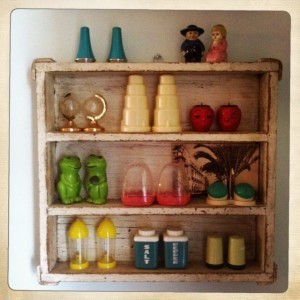 My favorites are vintage (surprise!) but I’m not attached to a particular era. Right now I’ve got art deco and forties and mod and seventies on display. I like a variety of materials, too…Bakelite, Pyrex, plastic, aluminum, iron, ceramic. And I am not particular about the subject, it just has to be cute. (Tiny furniture and fake fruits and vegetables happen to be cuter than average, it seems.)