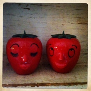 I tend to be a bit of a curator… it’s about both the hunt and the trophy. I don’t collect things primarily for quantity, but for uniqueness or charm. This week’s object of my affection is salt and pepper shakers. They hit all my sweet spots: they’re kitchen-y, useful, kitschy; they don’t take up a lot of room, they’re relatively common and pretty affordable, as long as you are patient. They are compact to store which means I can easily rotate my collection when whimsy strikes. And I *do* love to make a window display…