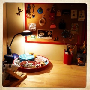 I like to make things…birds, collages, art, toys, assemblages…those subjects will each get their own feature at some point or another. One of my favorite places in my house is the crafty nook where I keep my art supplies and do my work. It’s a small area jam-packed with good stuff so I’ll have to spread the tour out over a few posts.