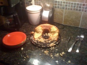 Ollie was big and goofy and awkward but a ninja in the kitchen. One night he silently helped himself to half a Bundt cake while I sat 15 feet away in the living room. Another time he surgically removed three muffins from a plate as I walked outside to greet members of my critique group. He didn’t disturb the tablecloth and the remaining muffins looked unmolested so I made a split-second decision to rearrange them on the plate and said nothing of the matter. Ollie was never ashamed or abashed when he binged on people food, he just looked optimistically at his discoverer as if to say, “That was tasty. Is there more?”