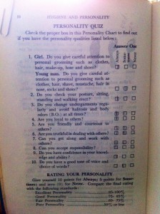 Don’t get the wrong impression – I don’t think this book is perfect. I laughed and laughed at the personality quiz (10 items, 40% of which have to do with physical appearance). The scoring notes suggest that these ten items can determine whether you have an excellent, good, fair, or poor personality, as though “who you are” is something that can be quantified. I’m thinking there’s no one “excellent” personality. This is a perfect example of the adage, “Beauty is in the eye of the beholder.” Someone you might find charming could be totally off-putting to others and vice versa. Which is good, because it means there are plenty of friends and mates to go around. Different strokes for different folks.