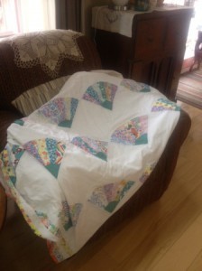 One year Pilly gave me a most amazing gift: a vintage quilt top that she had rescued from a thrift store and finished and bound. It was silky soft cotton, featured beautiful bright vintage fabrics, and was obviously a labor of love. When she confessed she had “merely” finished someone else’s handiwork, I loved it even more. Unfinished craft projects at thrift stores had always made me sad because I assumed the creator had given up after a lot of work, or worse, passed away. Finishing unfinished quilts hits all sorts of sweet spots for me: it saves me the most challenging work, it recycles existing goods, it finds a good home for someone’s hours of labor, and the end product is one of my favorite things…a blanket!