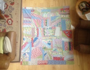 The fabrics are all gorgeous and the colors are so vibrant and the thing is – hang on to your hats – entirely hand-sewn and quilted. It is an insane amount of work. And I paid $30 for it after careful consideration. I look back and laugh because I had to think twice about the purchase: $30 at Value World usually buys me a cart full of clothes! But I went ahead and “splurged” and am so happy for having done so every time I wrap myself up in it or see someone else in my family seek it out. (Even the dogs).