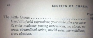 “No one before or since has been able to better this description. You cannot define charm in a word, measure it with a ruler, weigh it on a scale. Still, we know when we are in its presence; we are warmed by it and made to feel that life is good….The secrets of fulfilling your individual talent for charm are told in these pages. However, reading the secrets over or daydreaming about them will not make them yours. Bring consistent efforts to their application, and your power to charm becomes limitless.”
