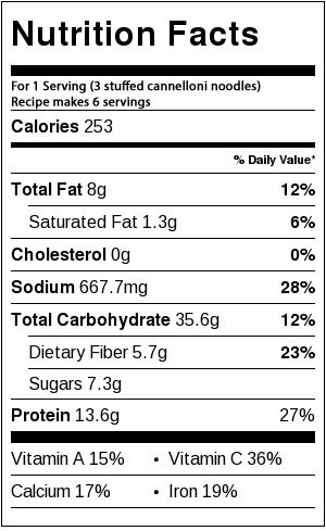 Bake 30 to 35 minutes until the cannelloni are tender and the sauce is hot. (Alternatively, follow the baking directions on your pasta package, it may vary). Remove from oven and garnish with basil leaves.