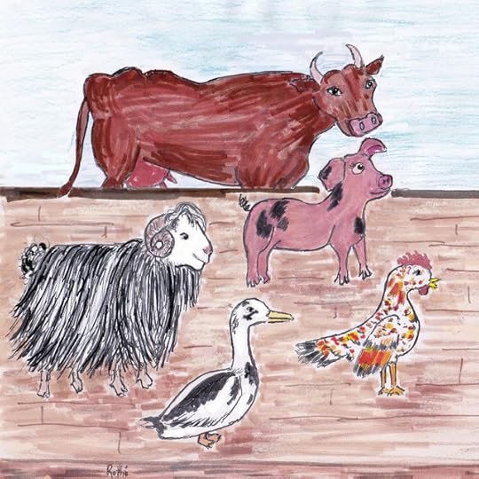Then, the very next morning, the storm broke. The animals poked their noses out of barns, coops, and sties, saw sunshine, and ran out rejoicing. Rams loped across the pasture and leaped over rocks. Pigs rolled in the nice fresh mud. Sundara spread his beautiful tail to dry, smiled, and said, “See. I told you. The rain makes sunshine brighter. Blue rolled his eyes and flew to the fence where he crowed.