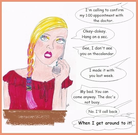 Going to the doctor is one of the things I most want not to do. It started when I was a kid and Dr. Green gave me my first shot and a green lollypop. I hate green lollypops. Today, I’m a grownup and I have choices. The answers I choose for when will I make an appointment with a doctor is,